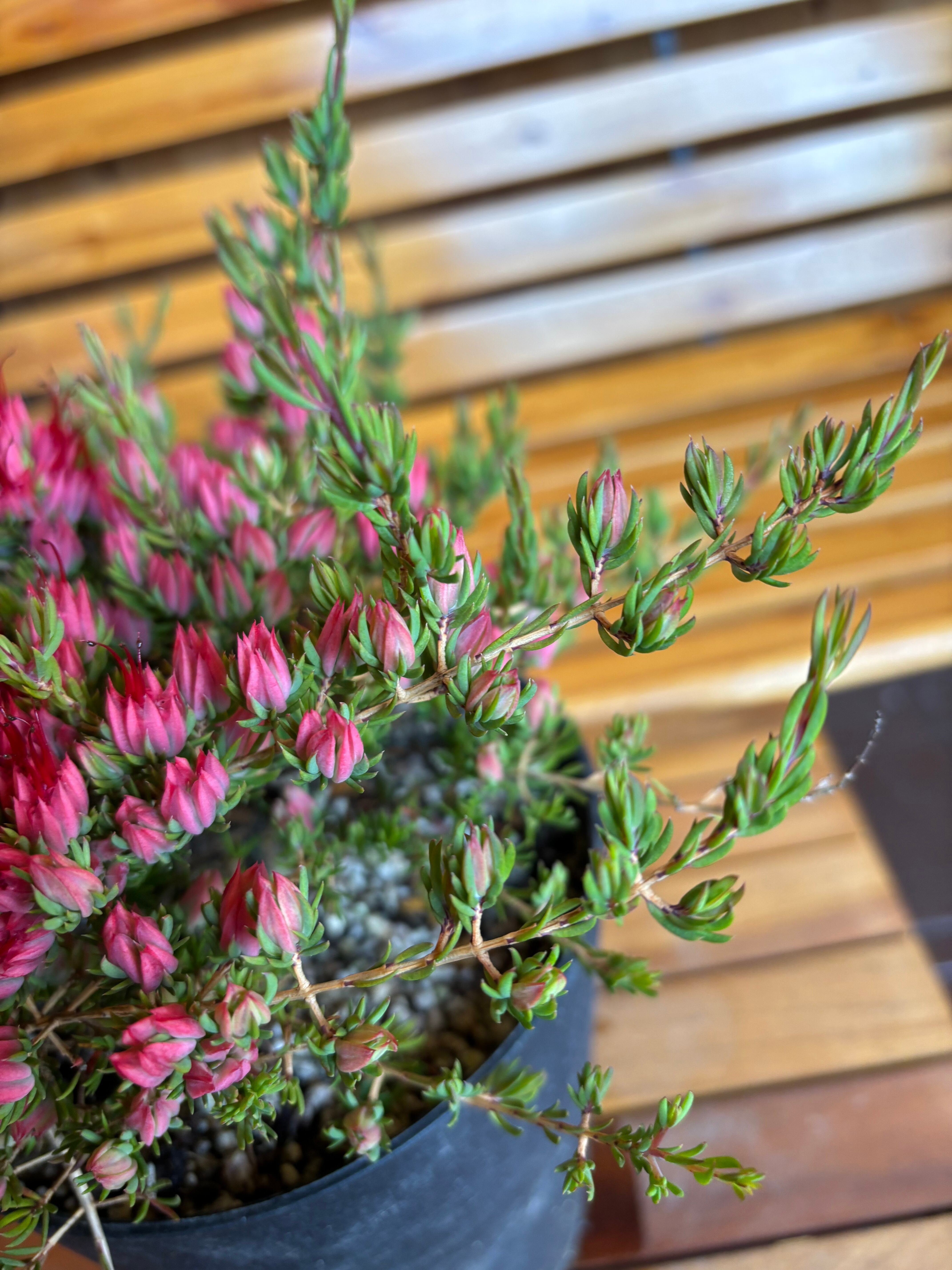 細長く柔らかい葉が枝に密生するように付き、早春に濃桃色の小花を株全体にびっしりと咲かせます^^ピンクの花弁に赤の核という鮮やかな花色で花の形状も独特の美しさです。花は甘く良い香りがします!
