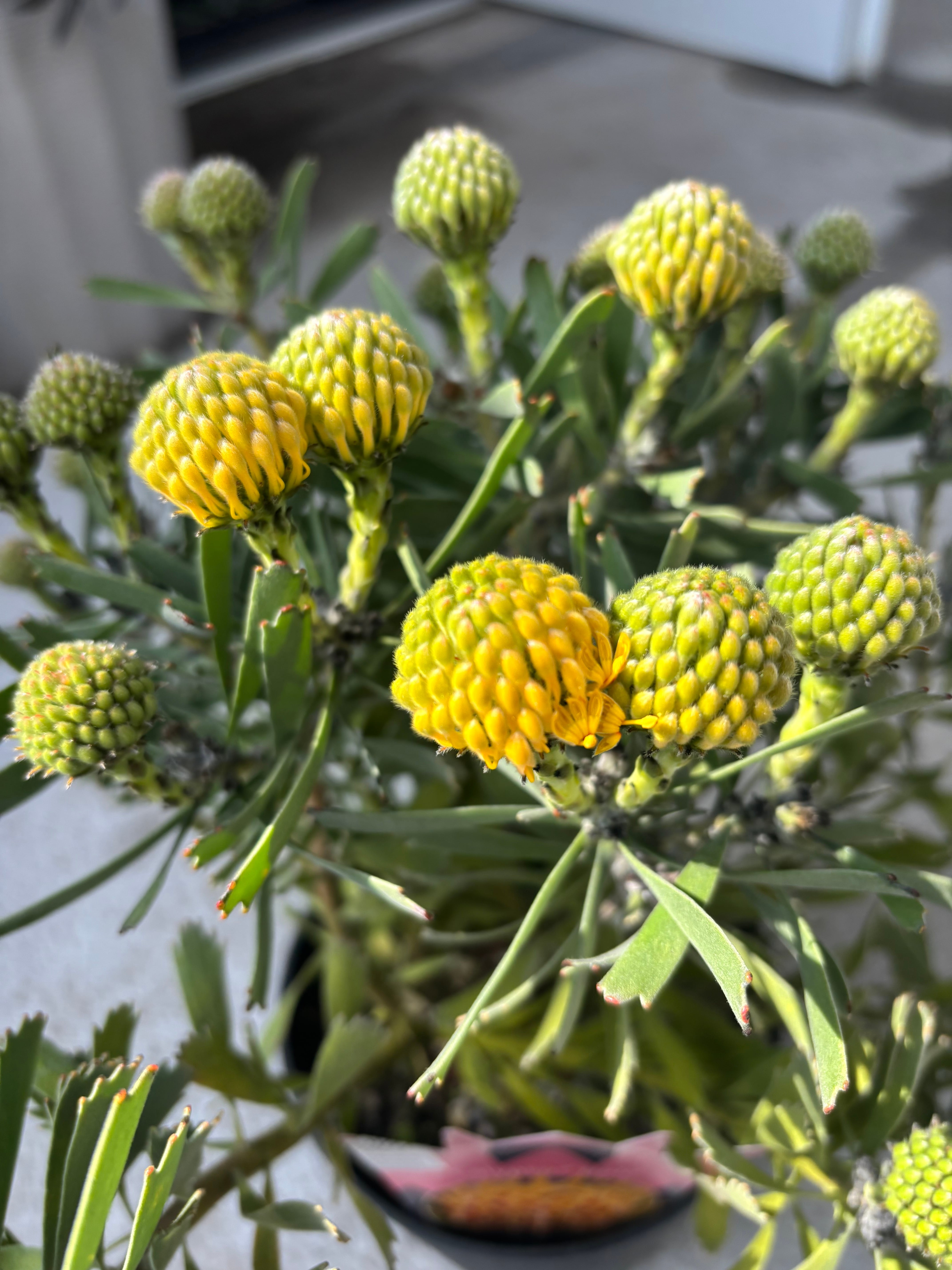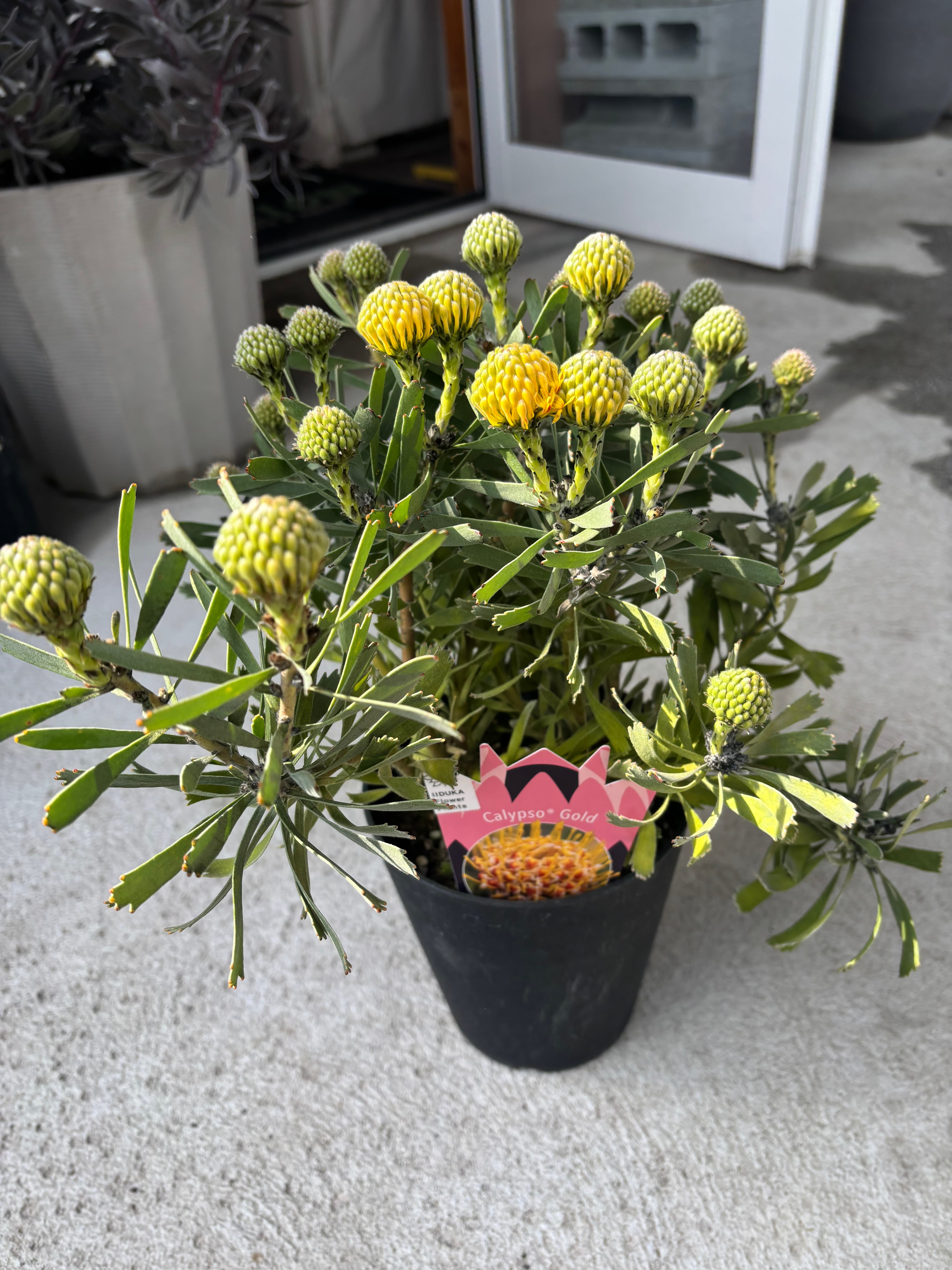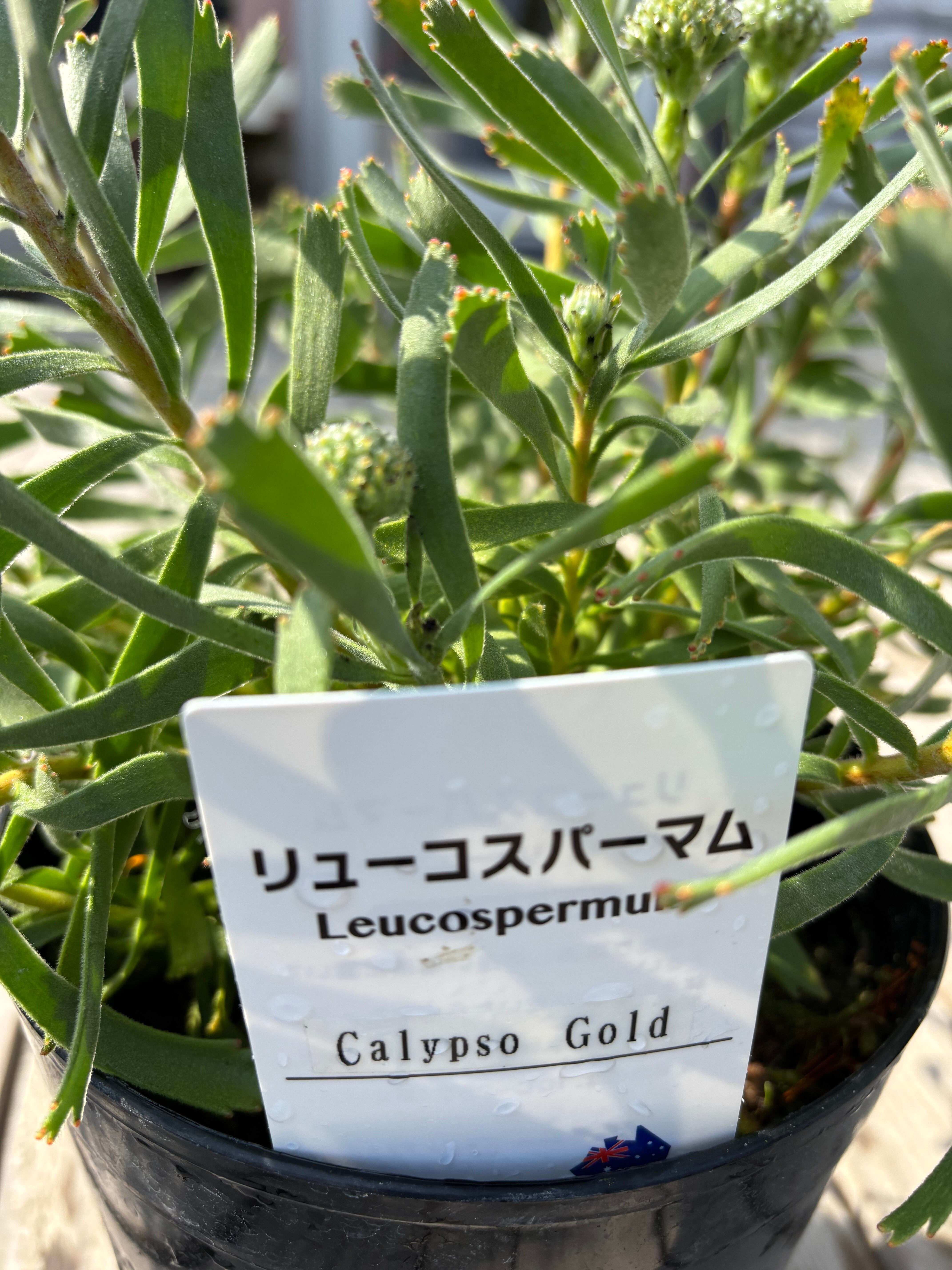 小さめの花がかわいらしいカリプソゴールド。リューコスペルマムは南アフリカやオーストラリアの常緑低木です。通常はピンクッションとも呼ばれ、針山に針が刺さったようなとてもユニークな花を咲かせます。針のような花を触るとつんつんとした不思議な感触です。切り花でも人気が高く、個性的な花は非常に持ちがよく、開花から3週間程美しい状態を保ちます。咲きはじめから徐々に色付いていき、花色の変化が楽しめます。