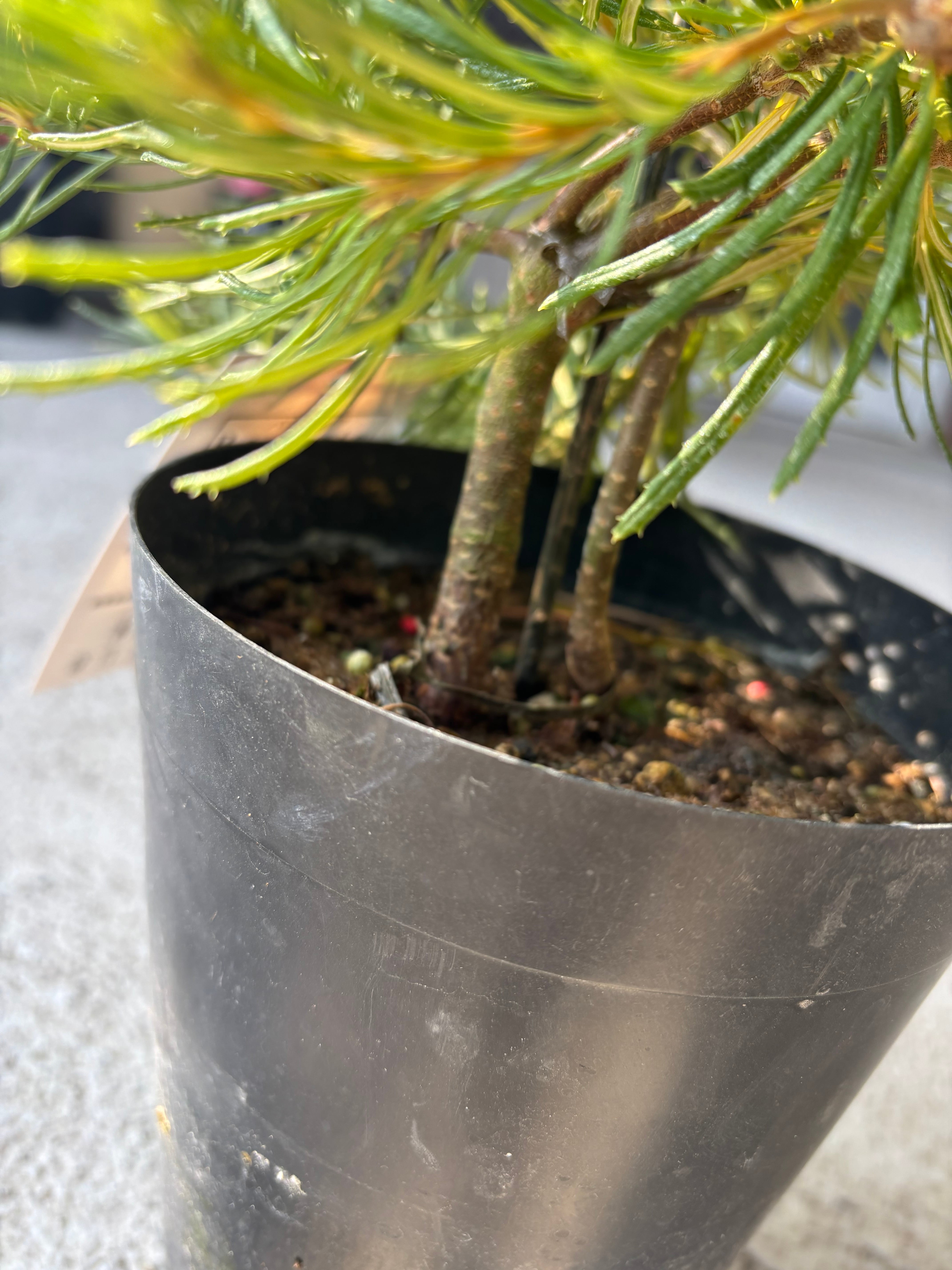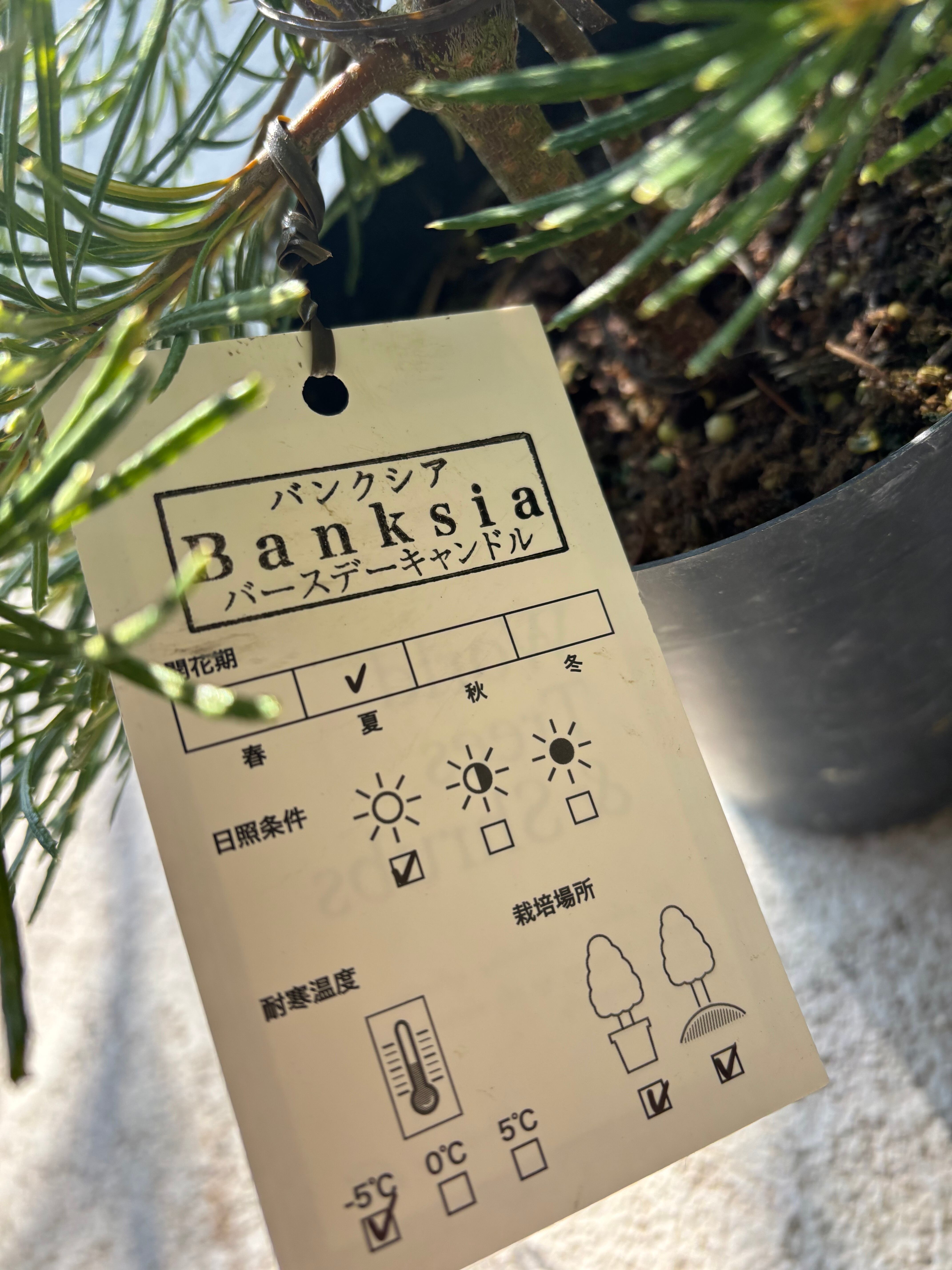 バースデイキャンドルは鉢物用に品種改良された矮性種のバンクシアです^^蕾がバースデイケーキのろうそくのような形をしています。ブラシ状の花は開花すると濃い黄金色となり、また花後はドライフラワーのようになって残り、花の変化を楽しめます!