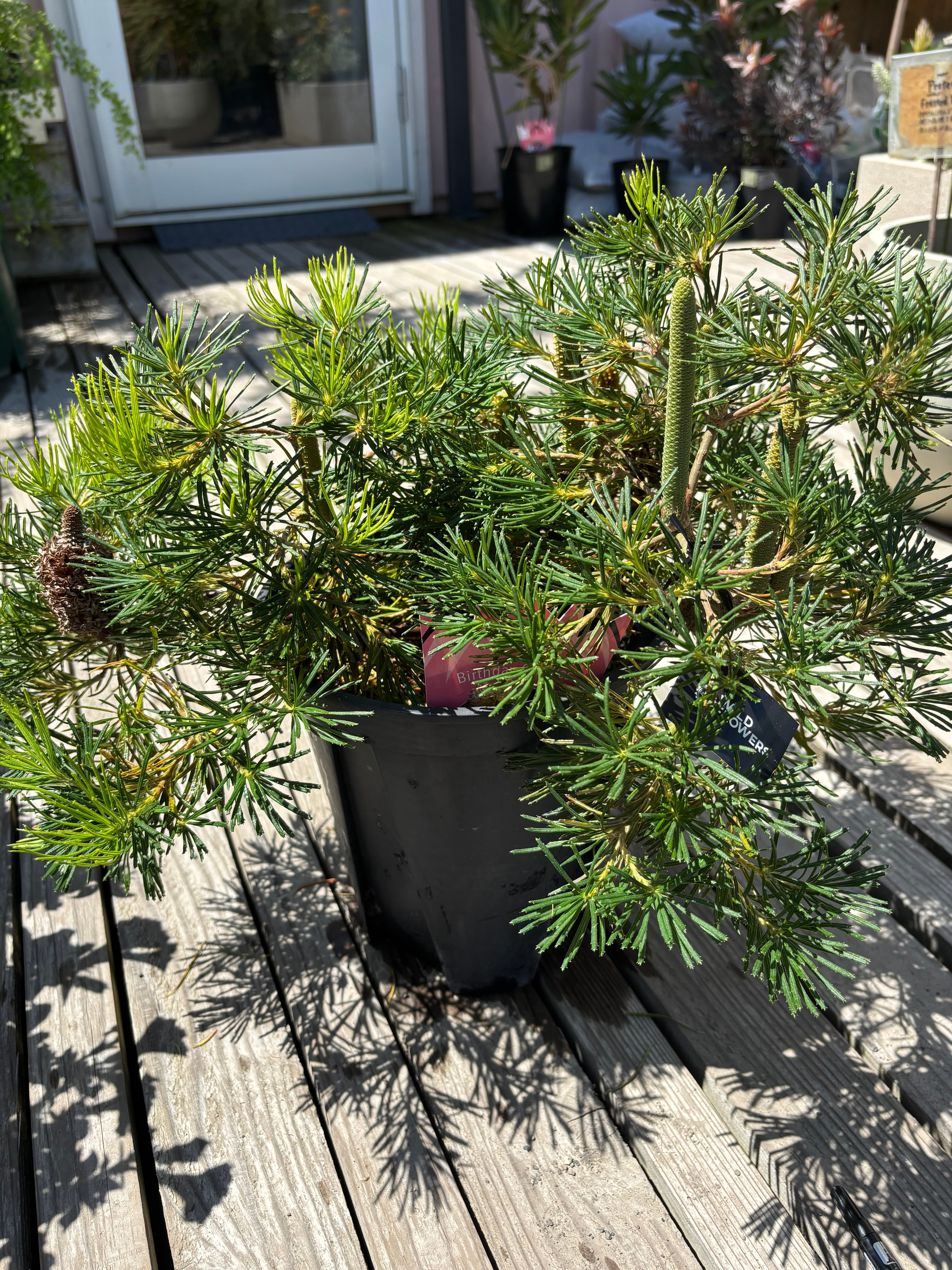 バースデイキャンドルは鉢物用に品種改良された矮性種のバンクシアです^^蕾がバースデイケーキのろうそくのような形をしています。ブラシ状の花は開花すると濃い黄金色となり、また花後はドライフラワーのようになって残り、花の変化を楽しめます!