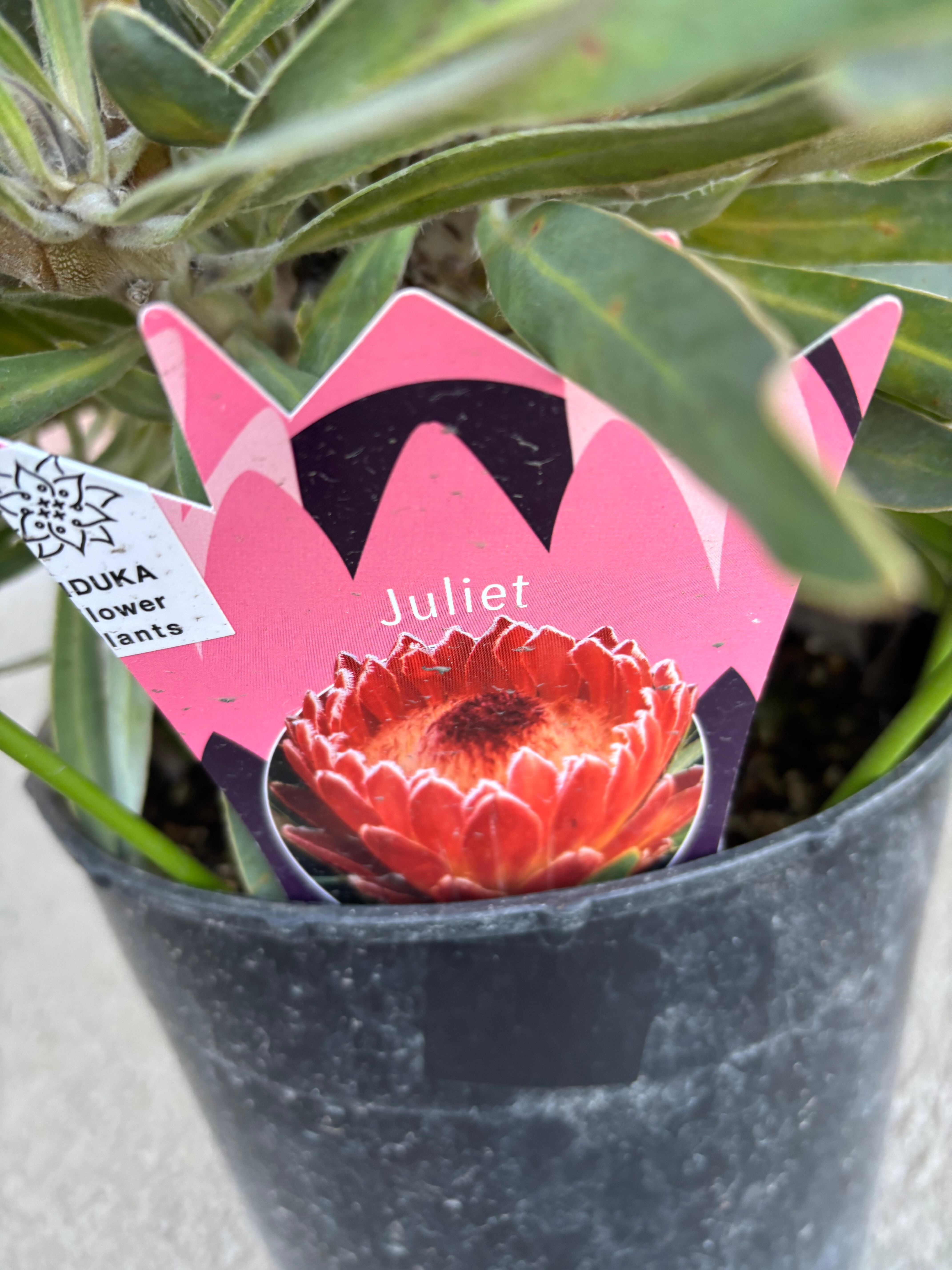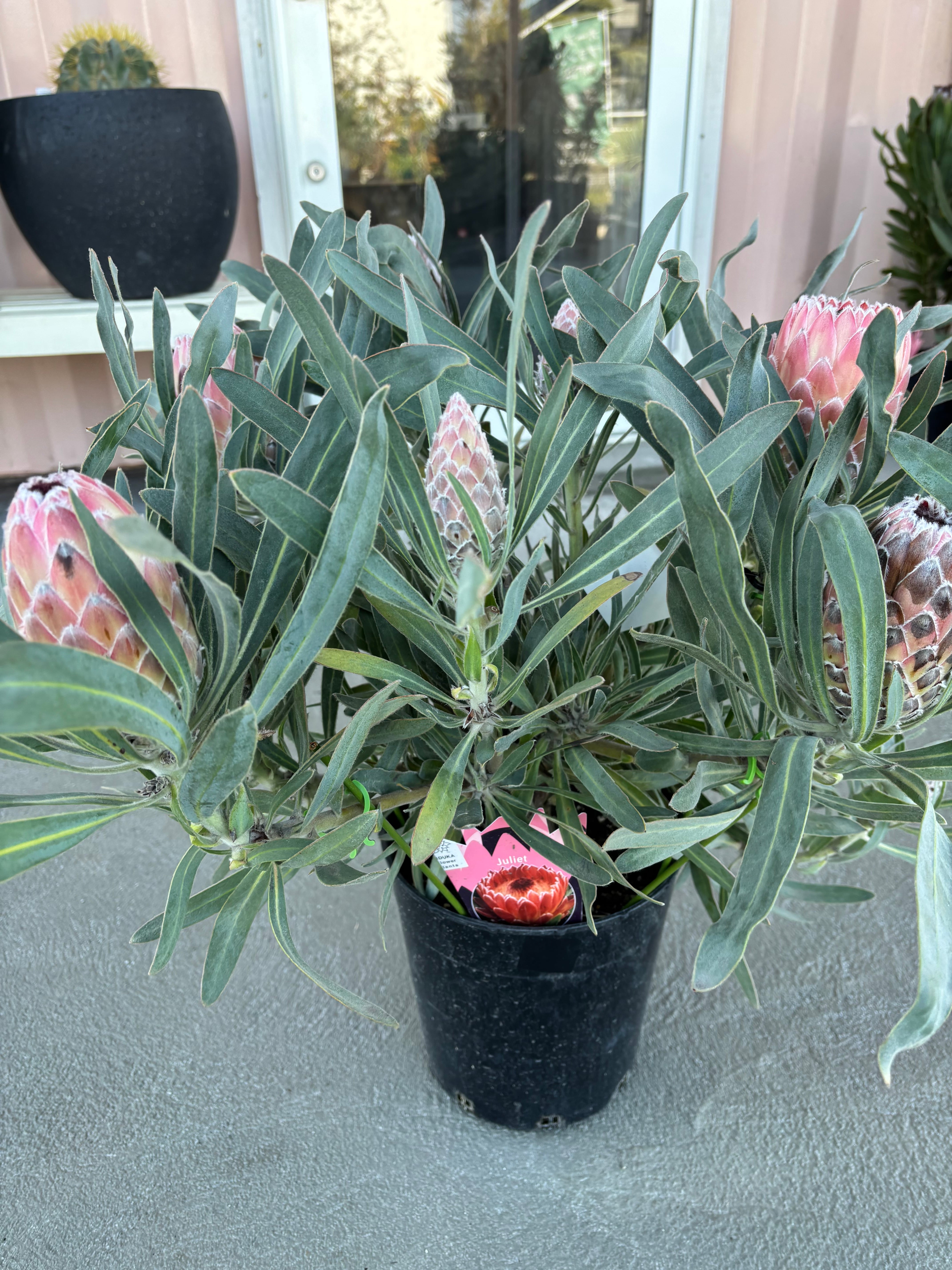 ジュリエットは、濃いピンク色の大きな花とシルバーがかった葉が美しくプロテアです。比較的コンパクトな品種です。この機会にぜひトライしてみてください^^