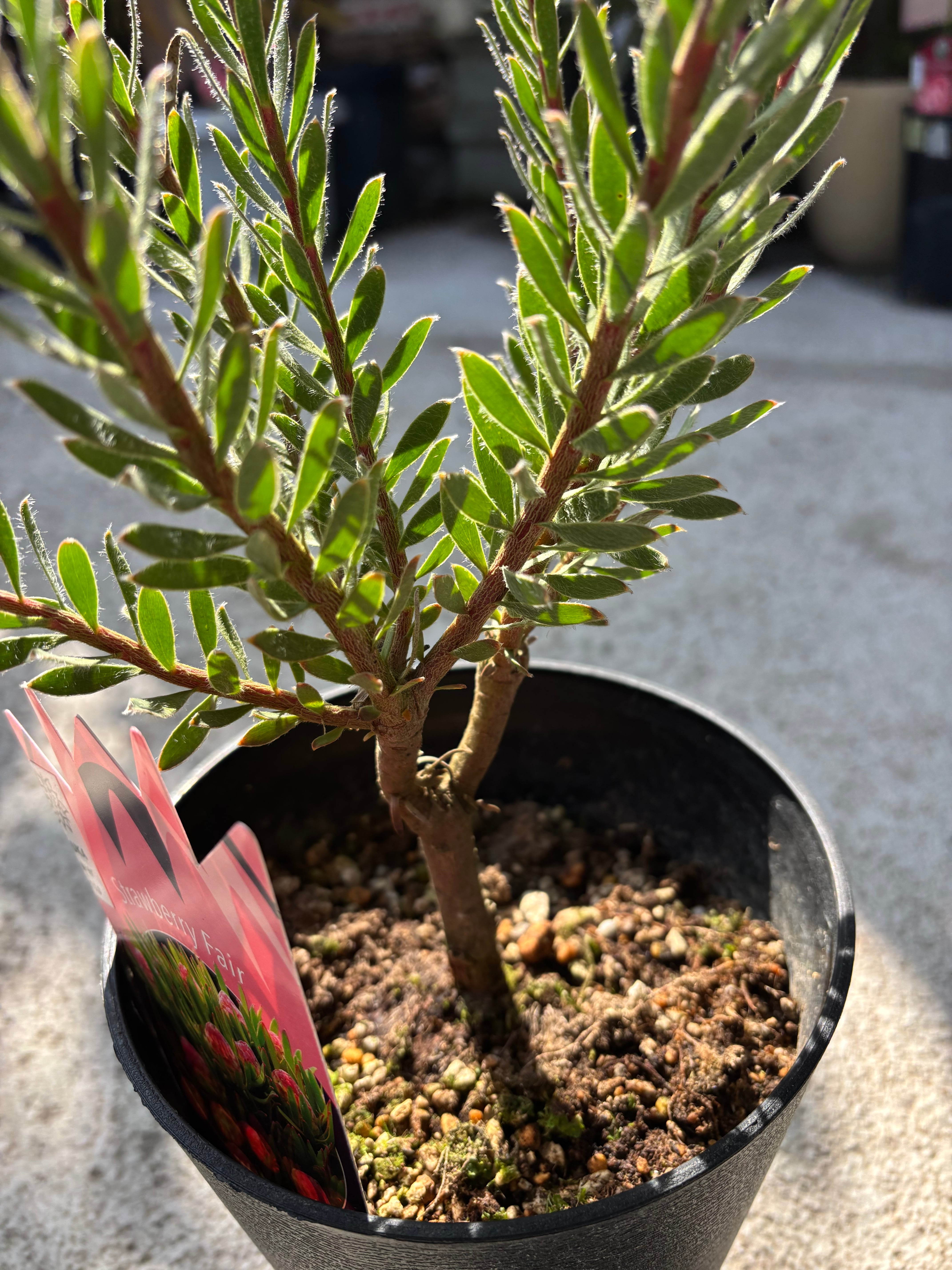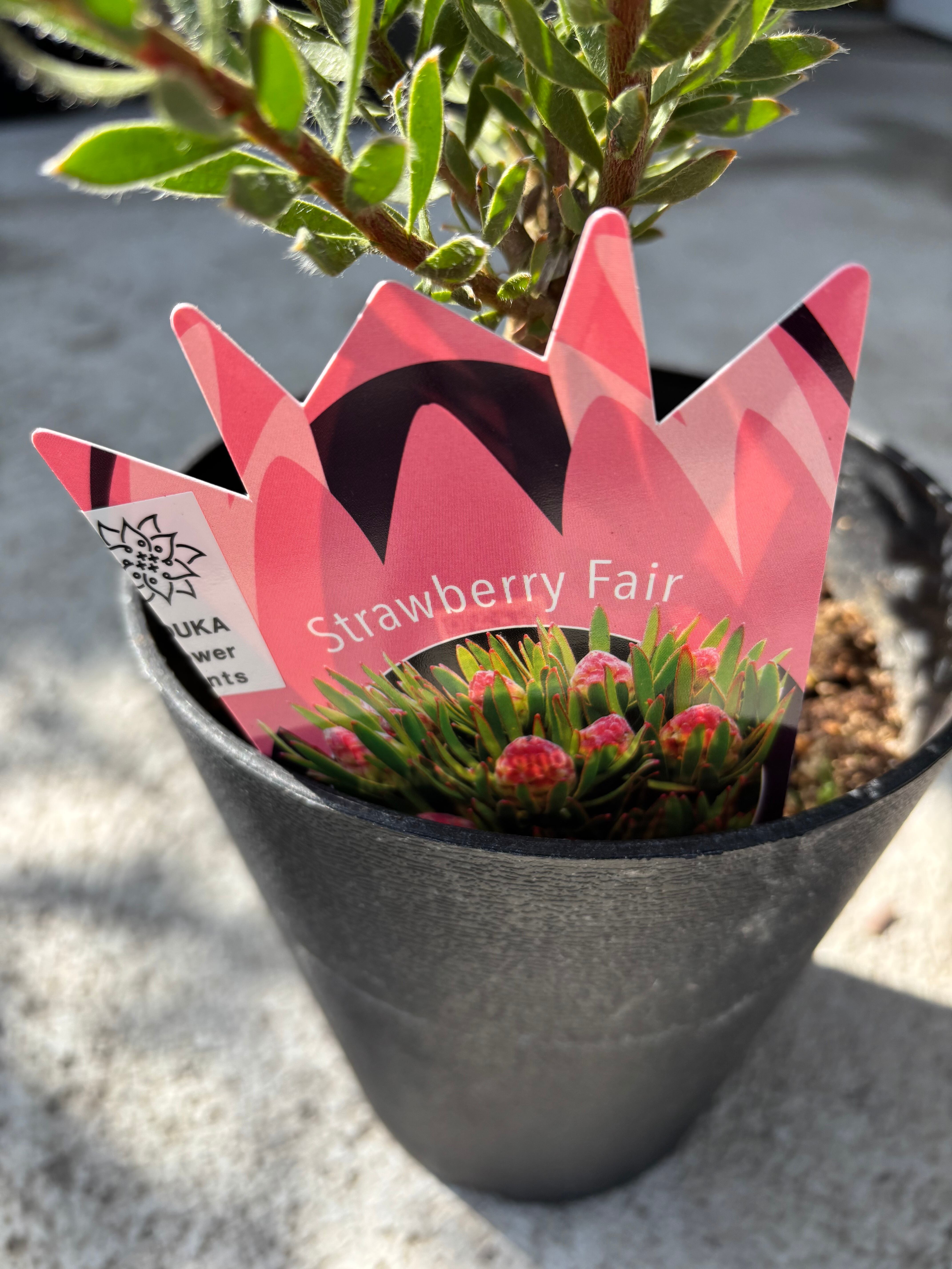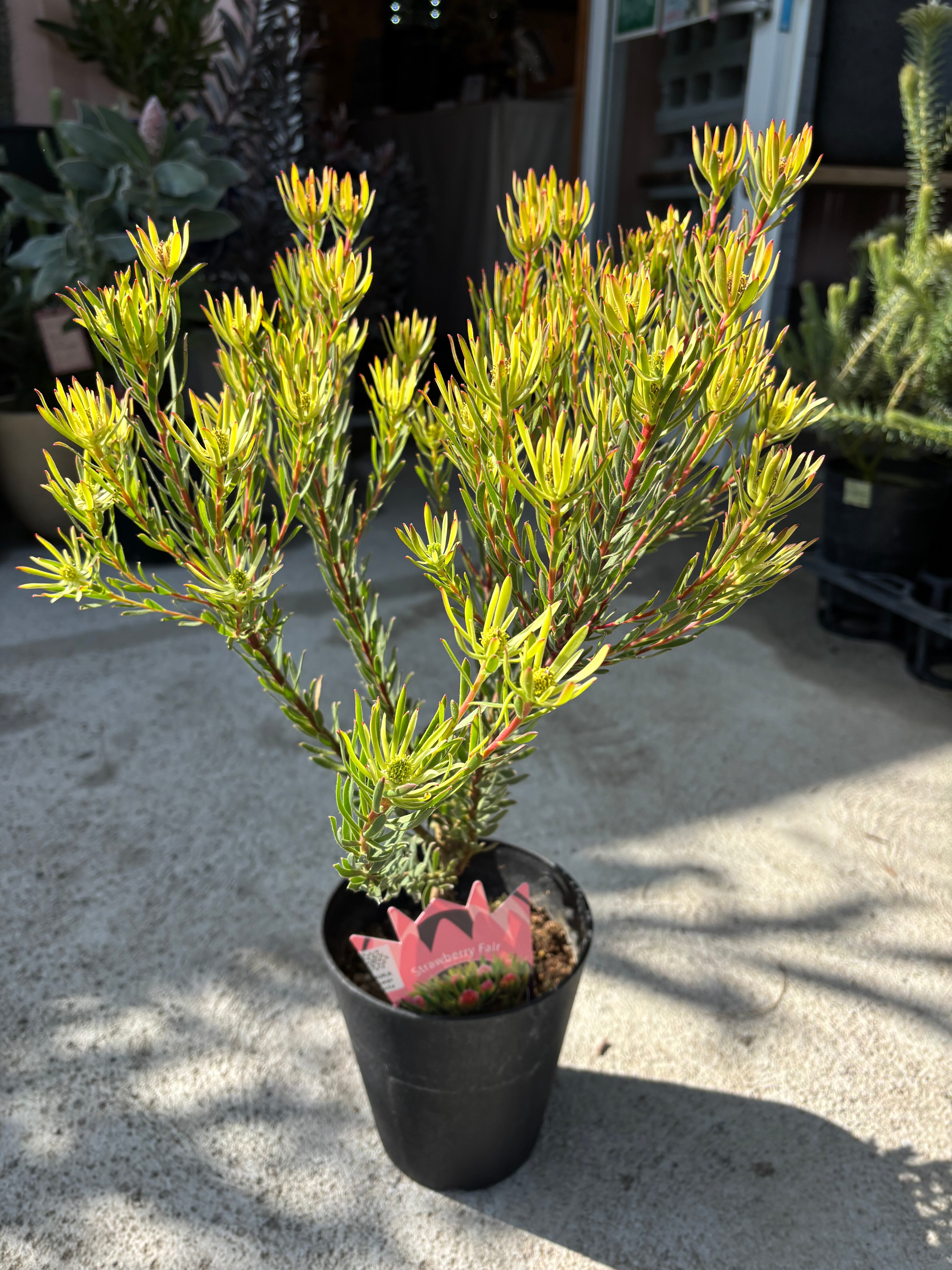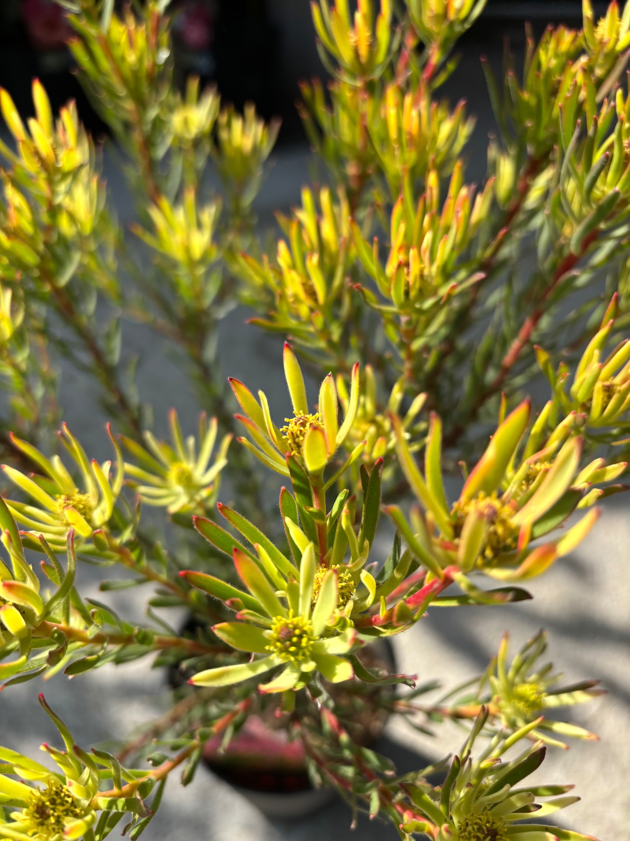 黄色を帯びた明るいグリーンの苞葉の真ん中に赤い花が咲く可愛いリューカデンドロン。