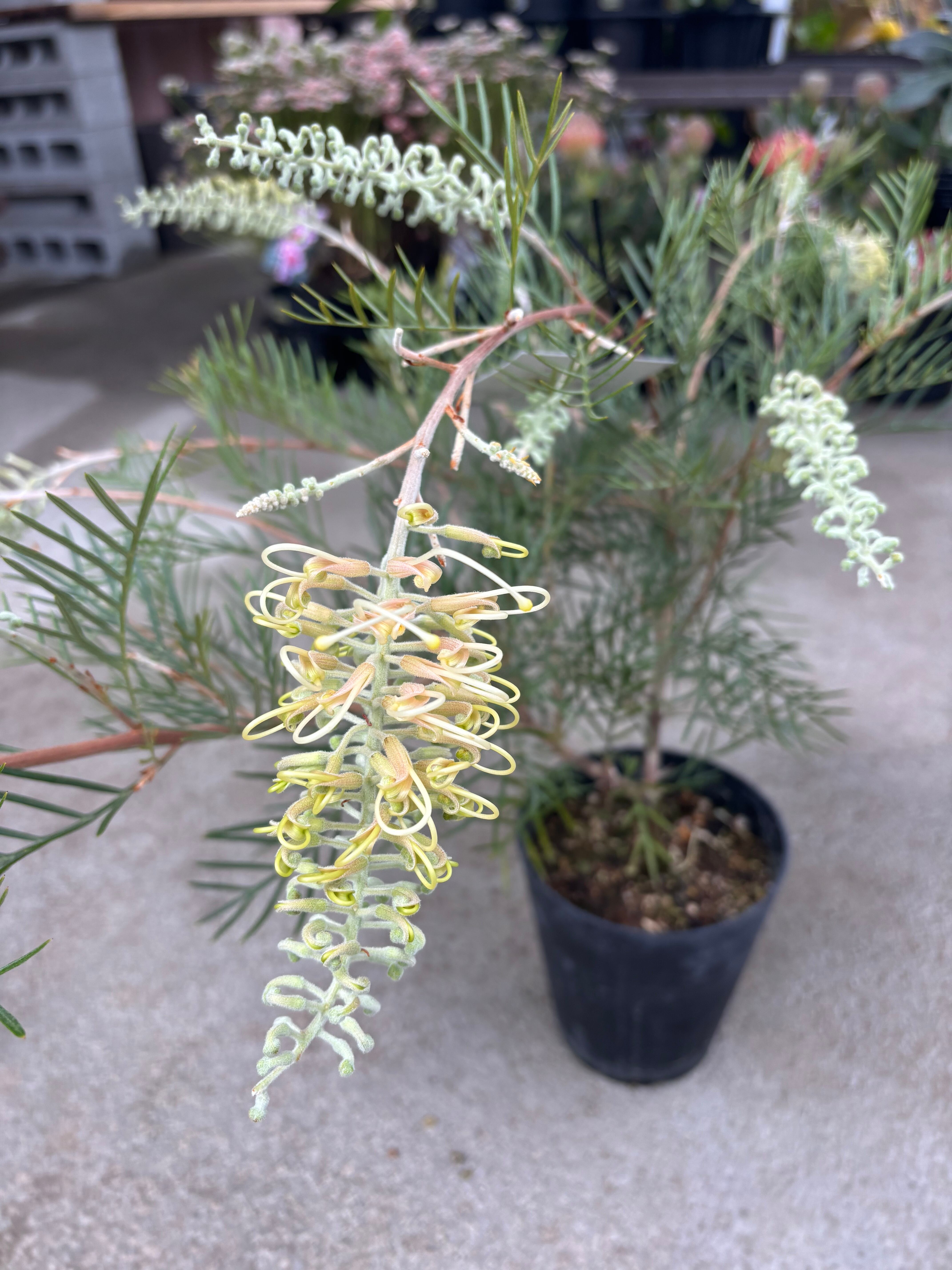 アイボリー色の大輪系のお花をたくさん咲かせてくれます。樹高は最大1.5mなのでコンパクトに育つグレビレアです。