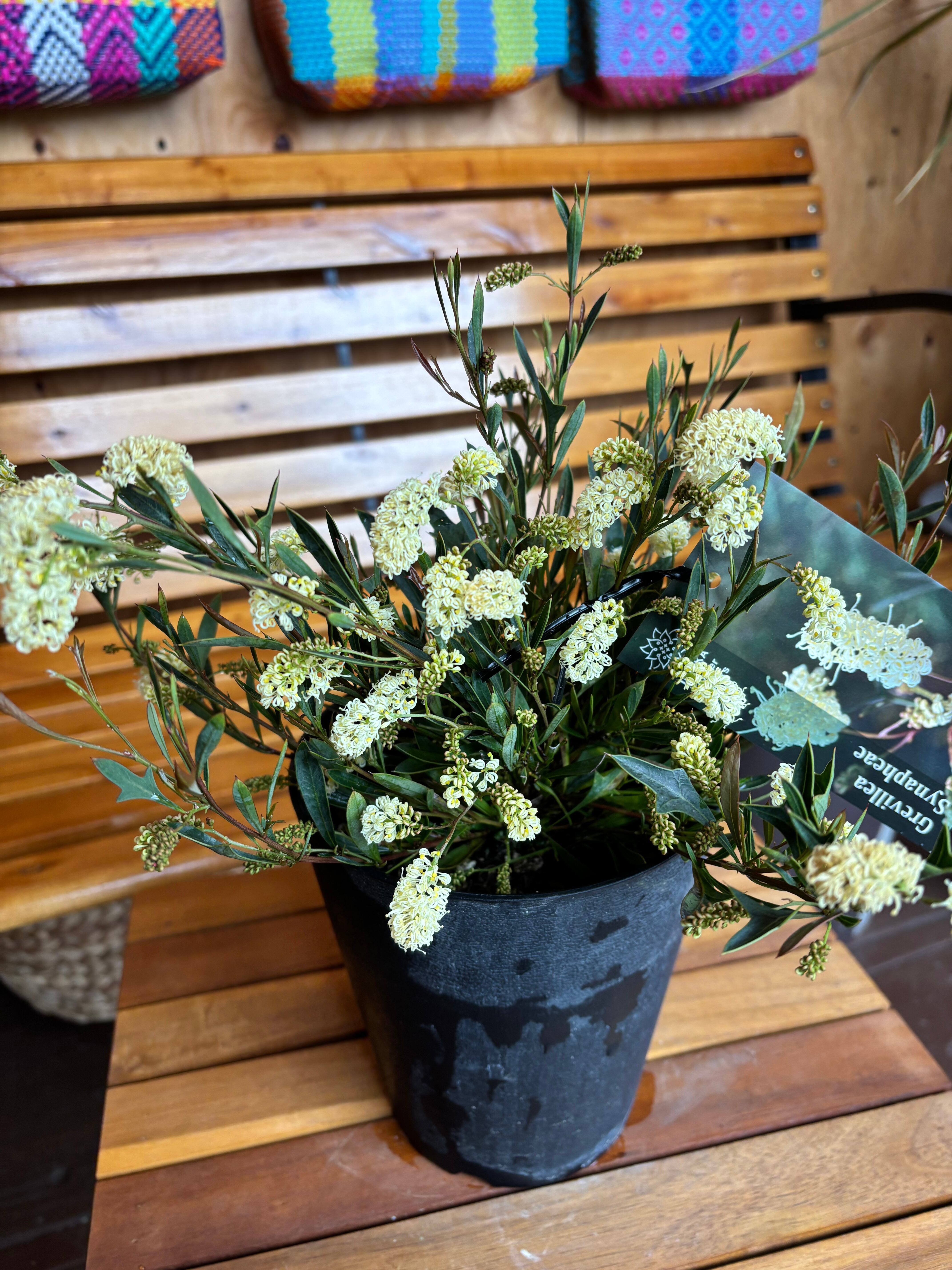薄黄色の可愛い花をたくさん咲かせるグレビレア。^^葉っぱも特徴的な形をしています!とても珍しい品種のグレビレアです^^