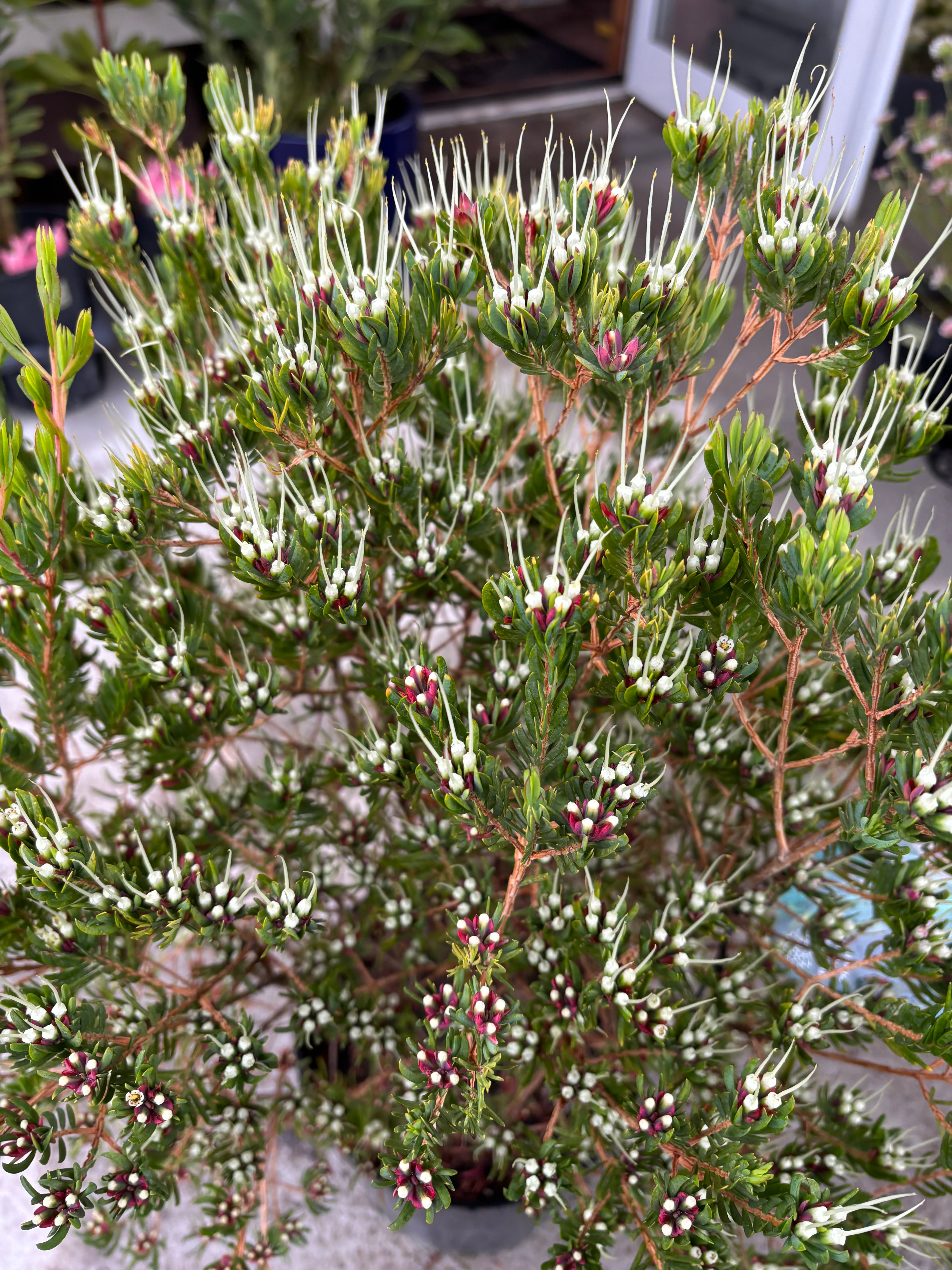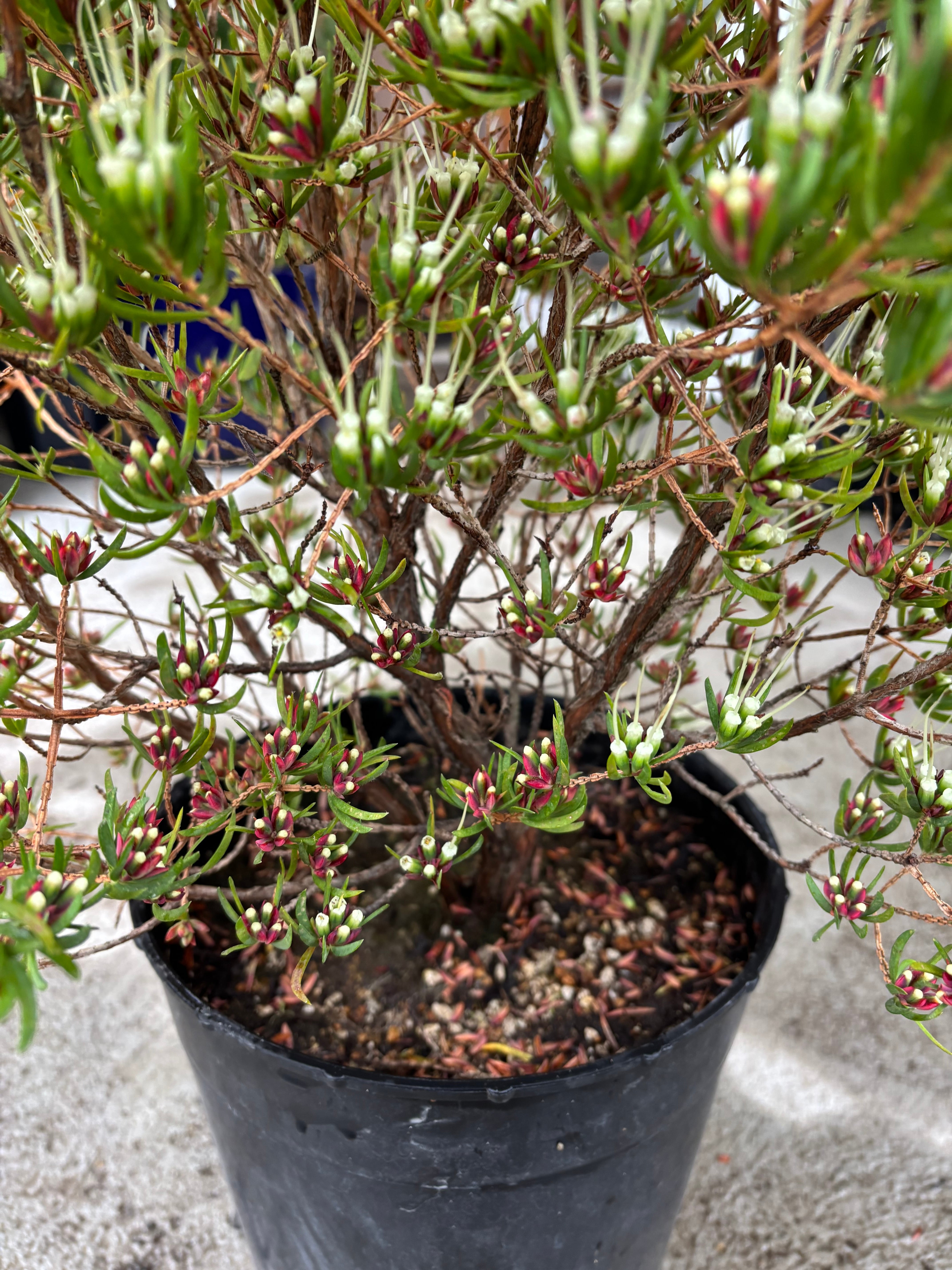 オーストラリア原産の常緑低木で、赤・白・緑の三色で出来た花はとても個性的でユニークです。 和風・洋風どちらのガーデンにも合うと思います^^