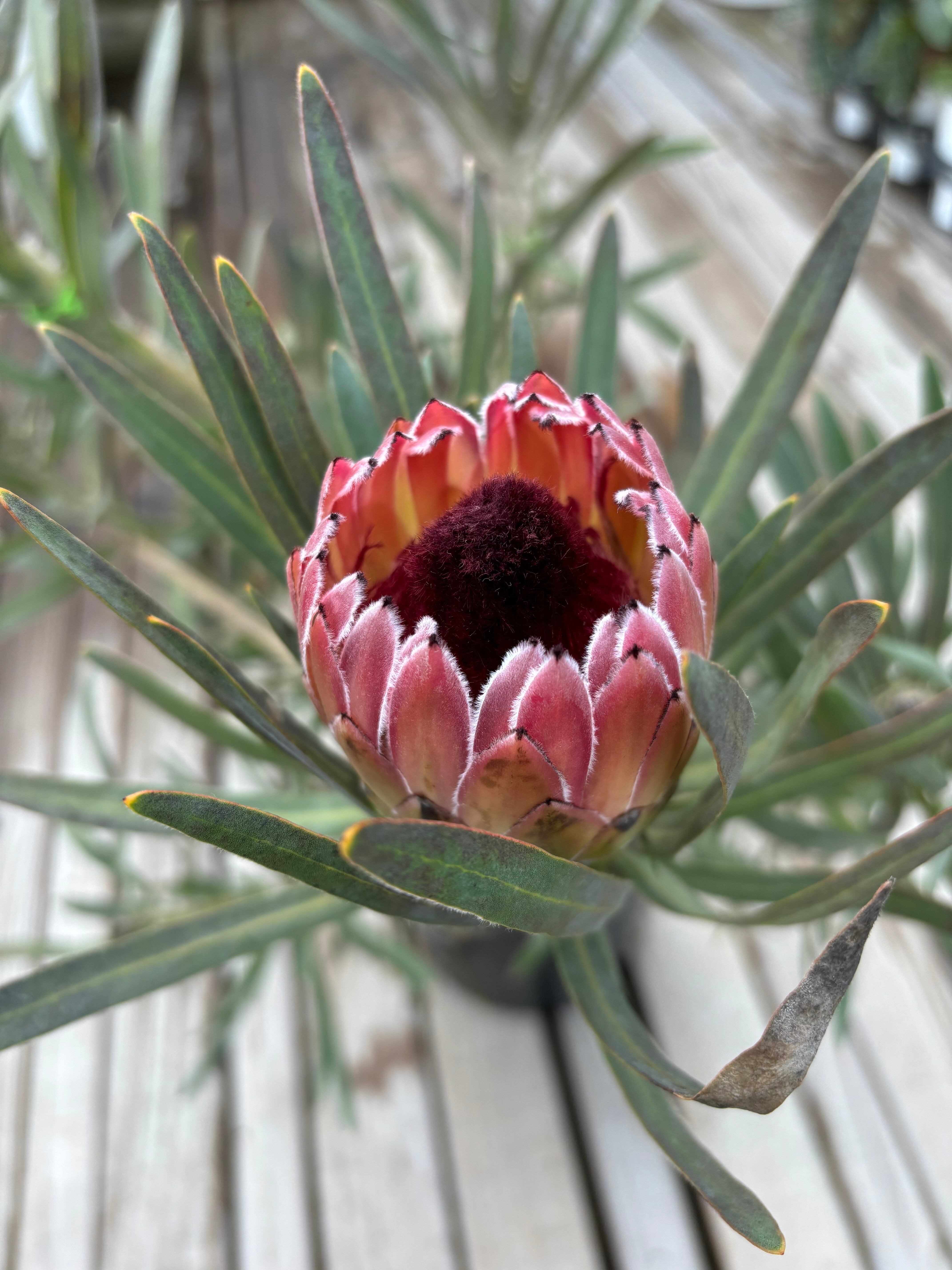 奥から覗く深紅の花と、毛羽立ったピンクの苞葉がとても艶やかで美しいです。細葉が大きな花を引き立てます^^レア品種でなかなか出回らないプロテアです。
