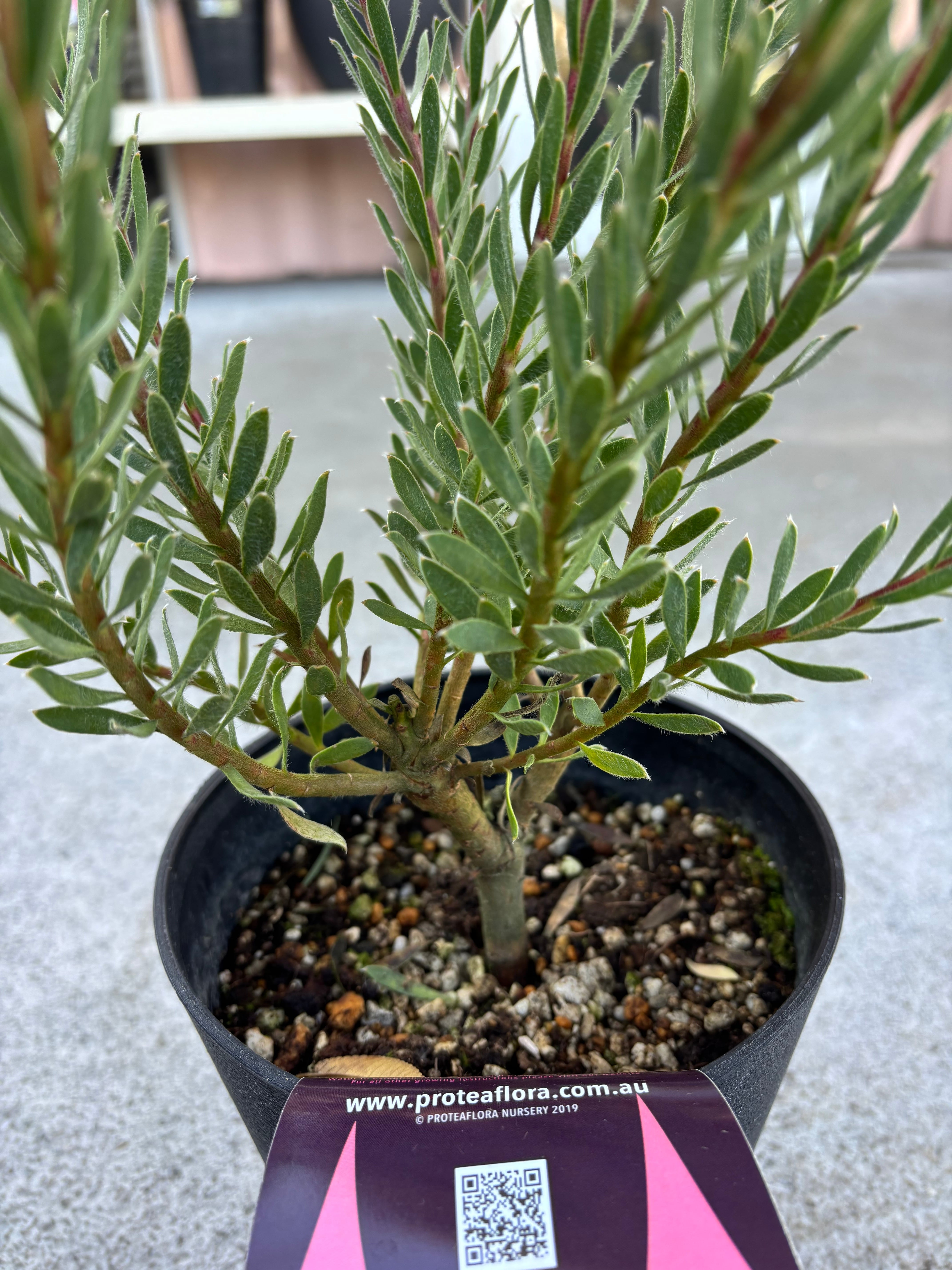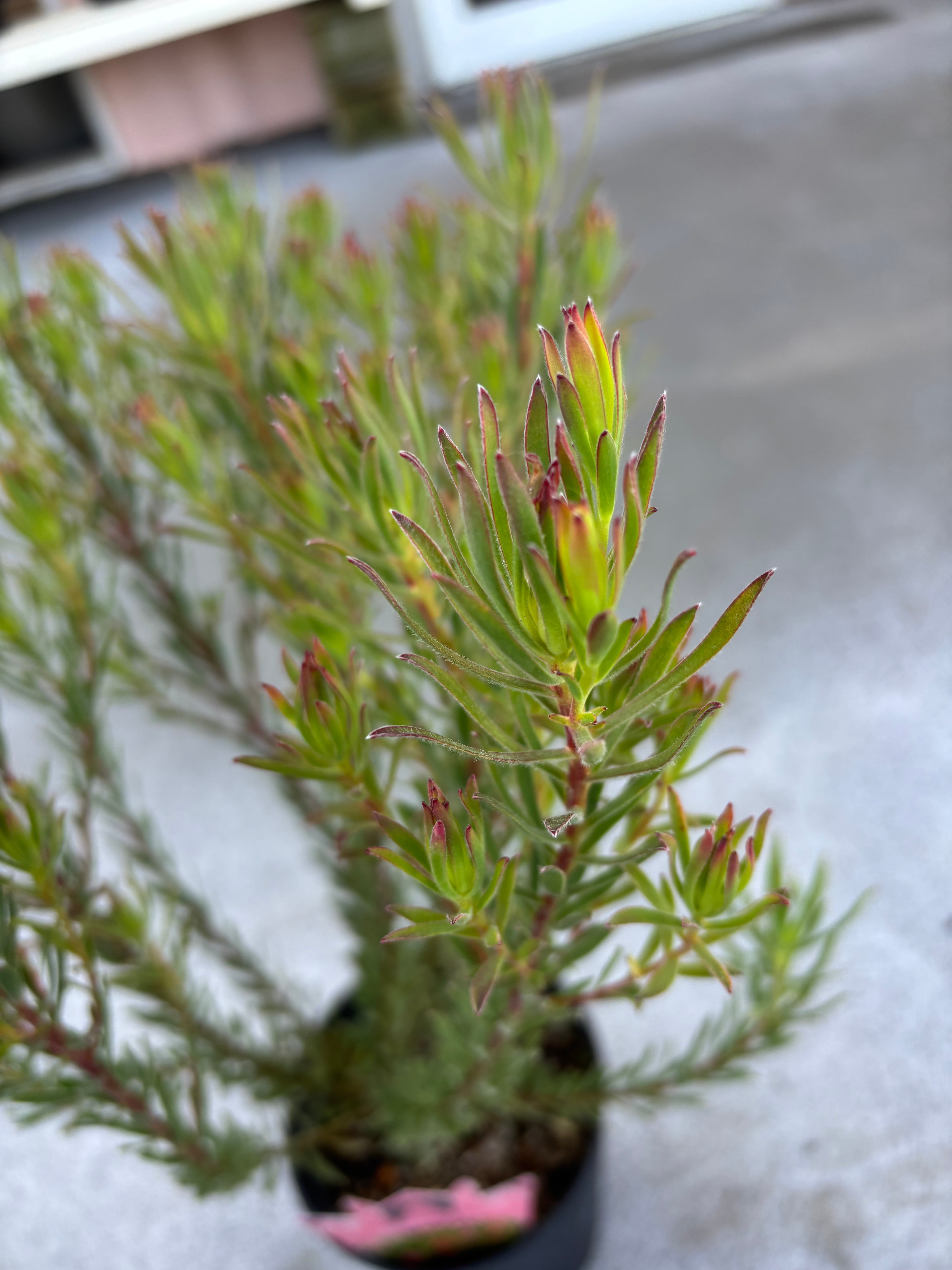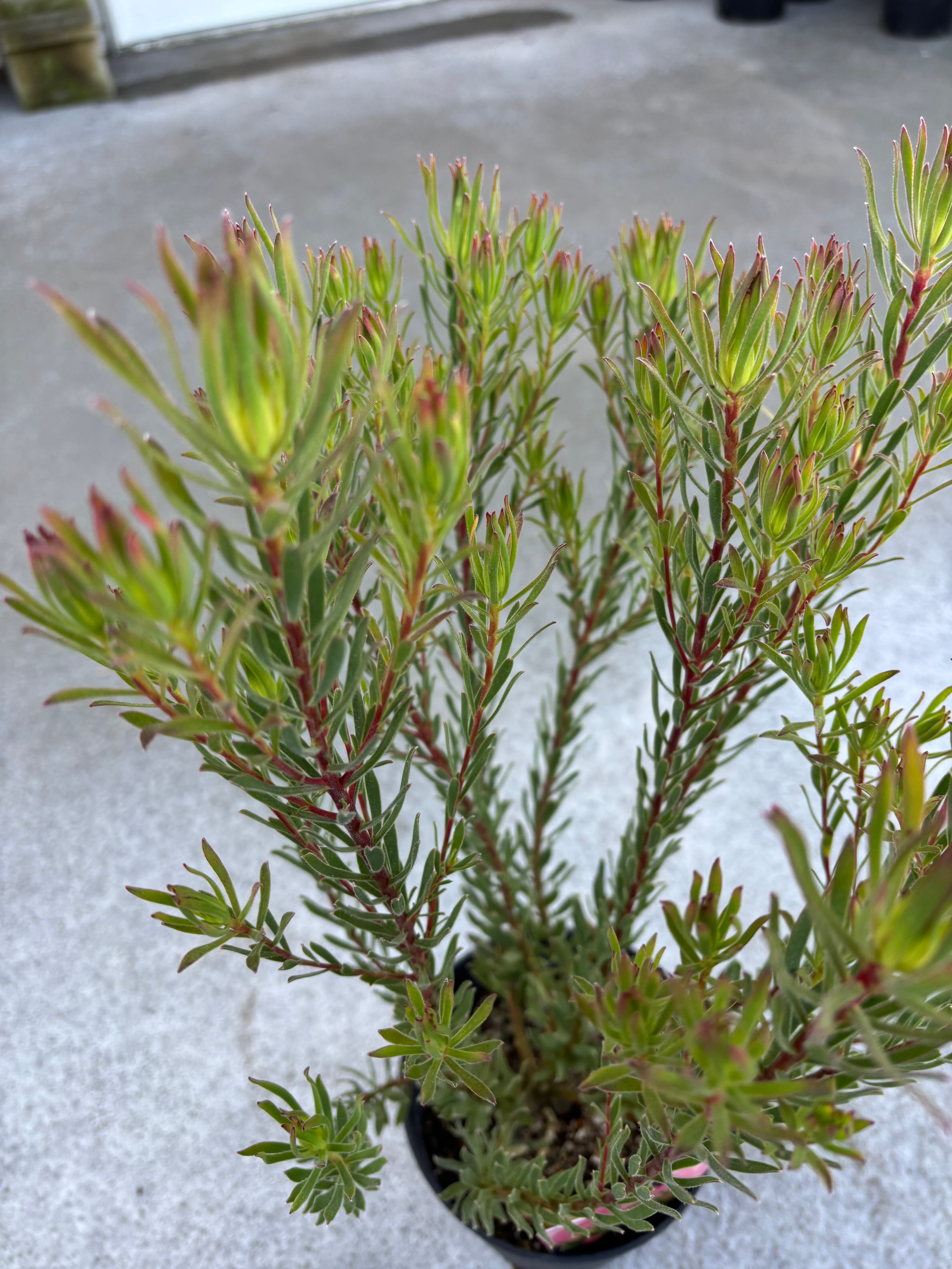 黄色を帯びた明るいグリーンの苞葉の真ん中に赤い花が咲く可愛いリューカデンドロン。