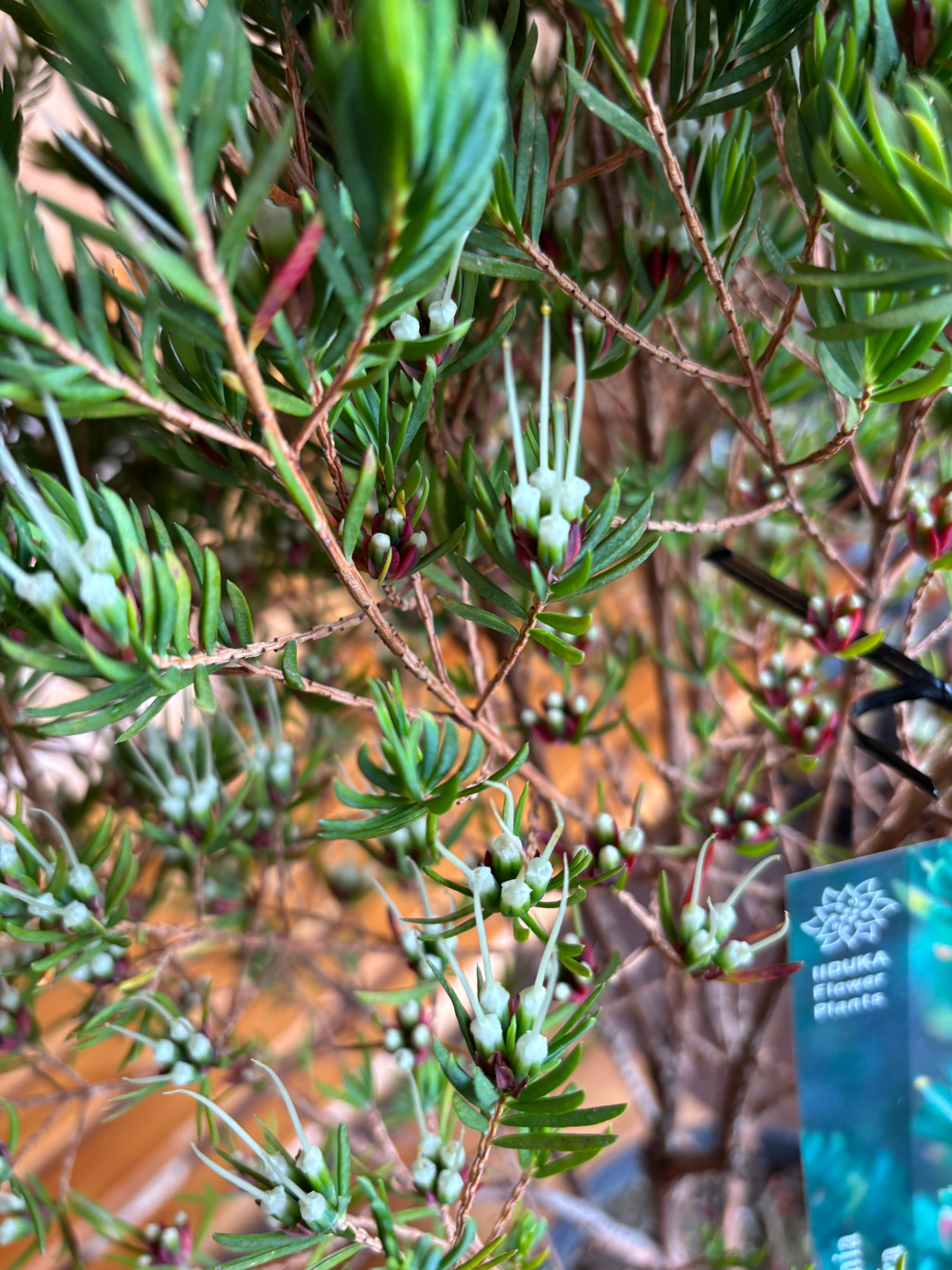 オーストラリア原産の常緑低木で、赤・白・緑の三色で出来た花はとても個性的でユニークです。 和風・洋風どちらのガーデンにも合うと思います^^
